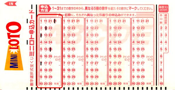 ミニロト申込カードには、A 欄から E 欄までの 5 つの枠があるので、最大 5 つの数字の組み合わせを買うことができます。
